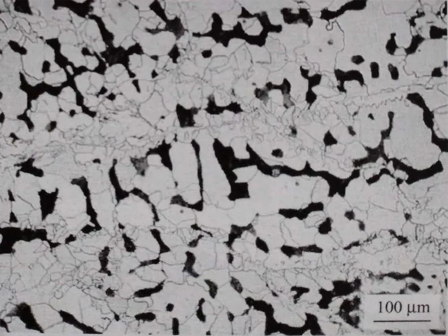 取鋼板截面試樣觀察,缺陷在截面表層呈裂紋形態,深度為0.3~0.8mm。高溫長時間氧化的特征十分明顯、裂紋內側有氧化鐵,一側有大量密集分布的氧化圓點。該類氧化圓點比較粗,放大200 倍下就能觀察到,與軋鋼裂紋周圍細小稀疏的氧化圓點有明顯區別,它是缺陷附近鋼基經高溫加熱氧化的產物。裂紋按形態分為兩類:一類呈粗大的半網狀(圖1-47) : 另一類呈折疊形態斜向伸入鋼基(圖1-48) 。經試劑浸蝕后,裂紋一側(出現氧化圓點側)組織有嚴重的脫碳(圖1-49)。根據以上特征初步判斷,缺陷在加熱軋制前就已存在,且位于板坯棱邊部或窄面。