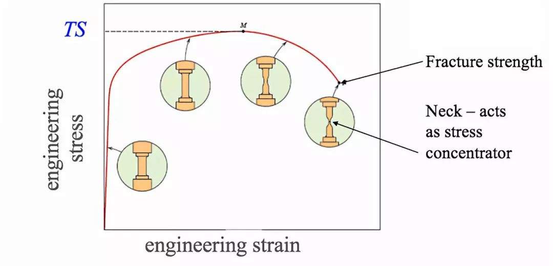 繼續增加應力,曲線達到最大值。最大值對應抗拉強度,這是曲線的最大應力值,由圖中的M表示。斷裂點是材料最終斷裂的點,由圖中的F表示。